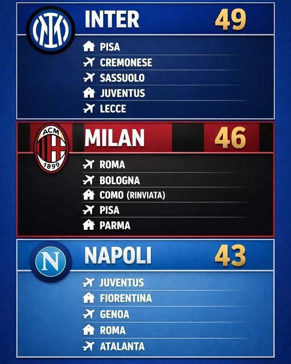 而如果对比意甲前三名球队最近5轮的联赛赛程,就能发现这对于国米来说也是关键赛段!国米最近5轮只有尤文一支强队,而且还坐拥主场优势,有望报首回合失利之仇,其他四个对手比萨、克雷莫内塞、萨索洛和莱切实力都不算强,即便客场作战,拿下对手应该也不会有太大问题。